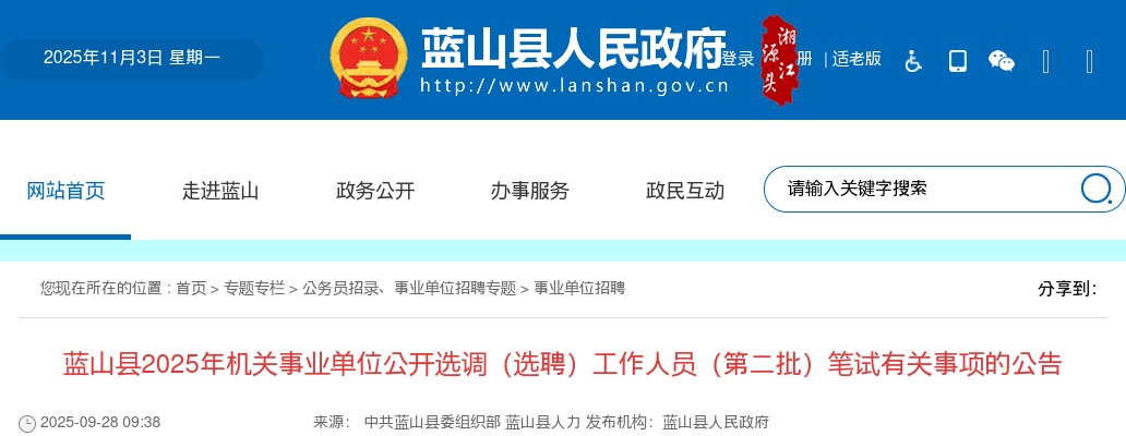 根据《蓝山县2025年机关事业单位公开选调(选聘)工作人员公告(第二批)》有关规定和工作安排,现将蓝山县2025年机关事业单位公开选调(选聘)工作人员(第二批)笔试有关事项公告如下: