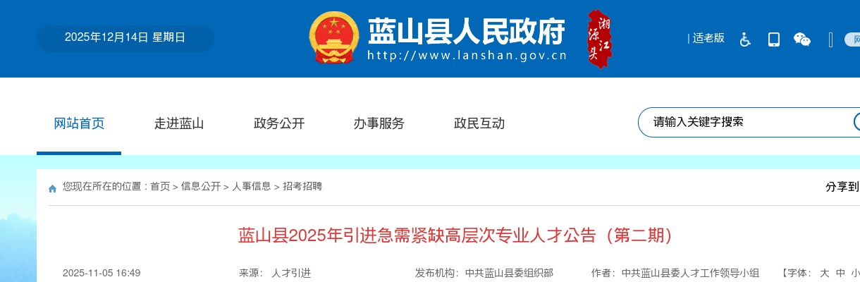 原标题:蓝山县2025年引进急需紧缺高层次专业人才公告(第二期)