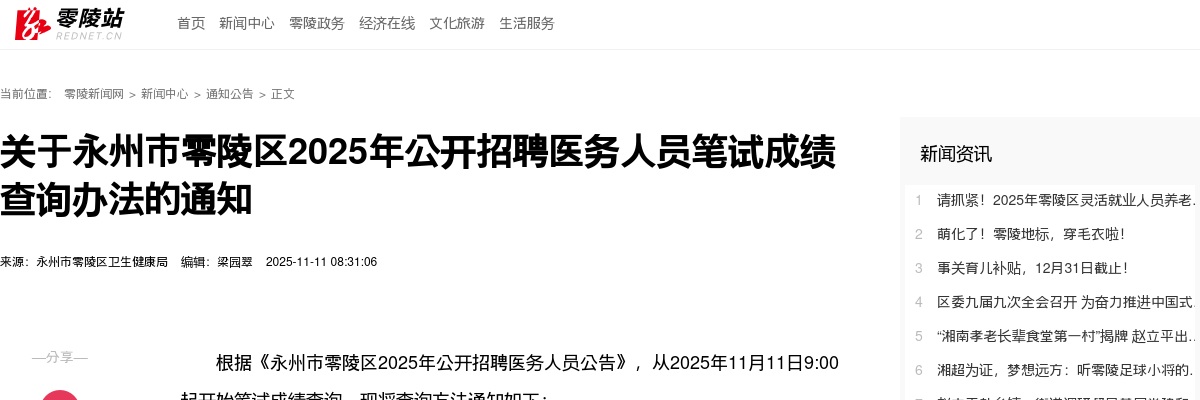 原标题:关于永州市零陵区2025年公开招聘医务人员笔试成绩查询办法的通知